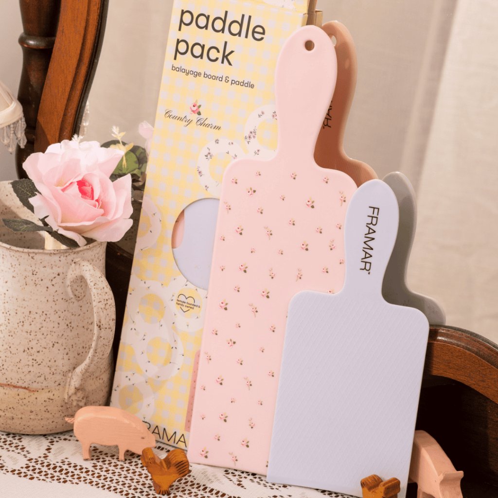 Limitovaná edice s originálním motivem obsahuje dvě paddle podložky – modrou (15,2 × 10,8 cm) a větší růžovou (23,5 × 10,2 cm) – ideální pro různé techniky barvení vlasů, včetně balayage a free-hand.